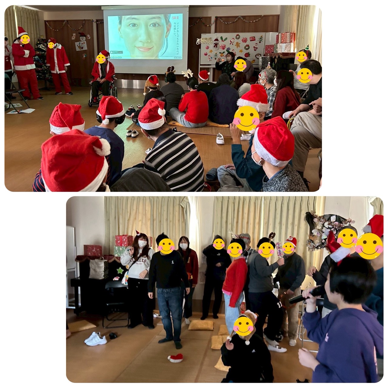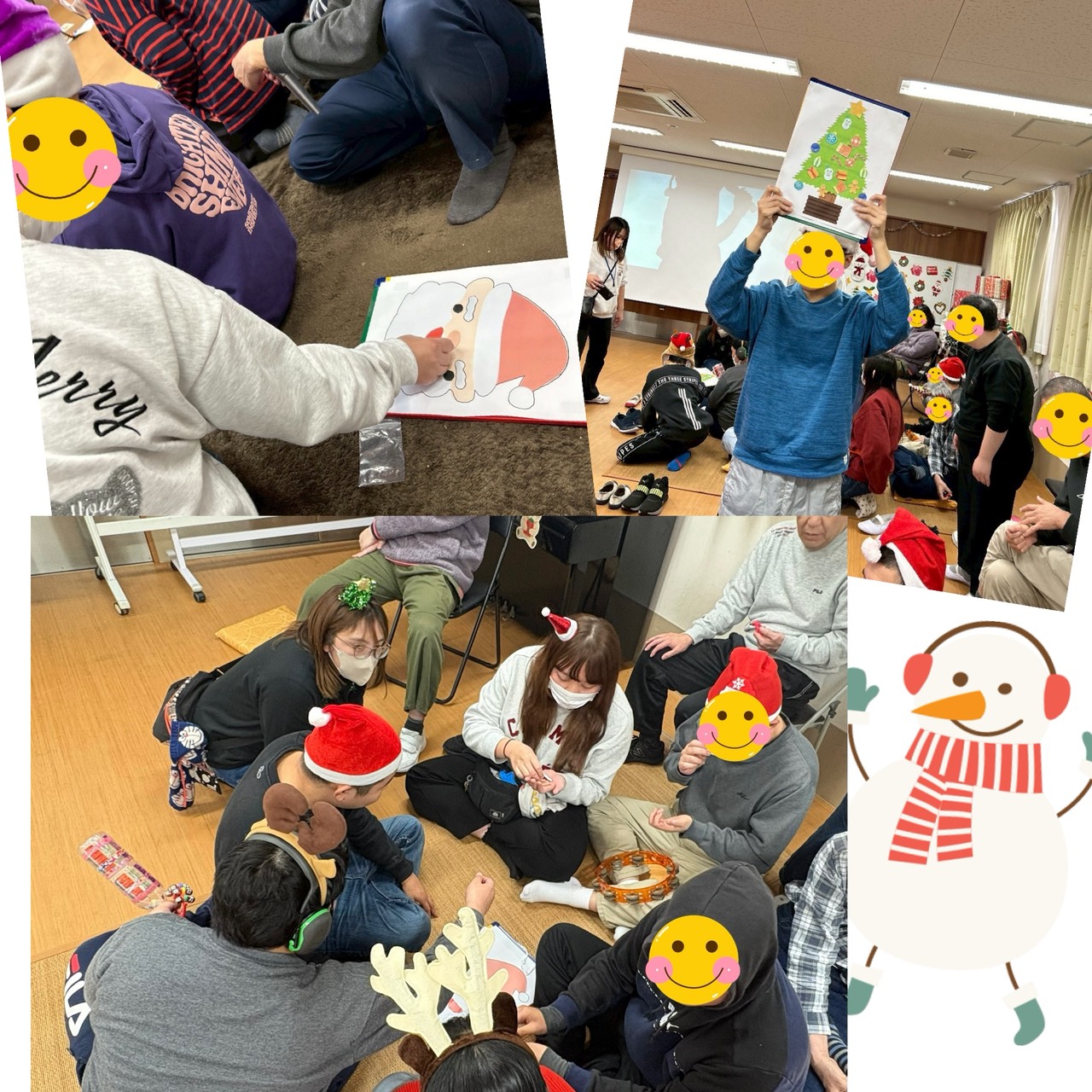 ゲームは福笑い、ビンゴを行いました。福笑いではツリーとサンタさんの顔とみんなが楽しみやすい内容でとても楽しんでいました🎅